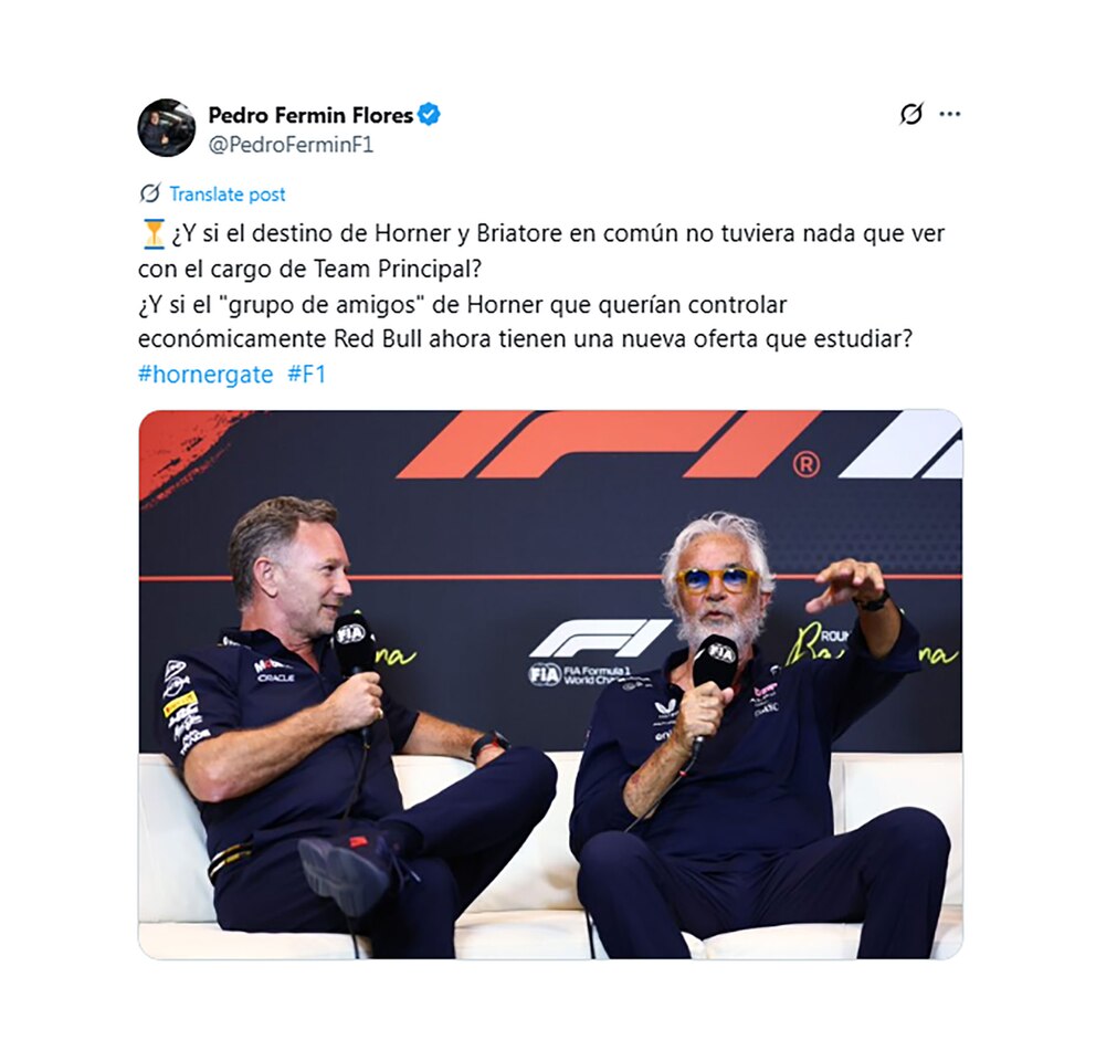 “¿Y si el destino de Horner y Briatore en común no tuviera nada que ver con el cargo de Team Principal?“, se preguntó el periodista español, Pedro Fermín Flores, quien tiene más de 20 años en coberturas de la F1. Suele manejar buena información y también es youtuber (TheGodFlores). ”¿Y si el “grupo de amigos” de Horner, que querían controlar económicamente Red Bull, ahora tienen una nueva oferta que estudiar?“, fue el otro interrogante planteado por el comunicador en su cuenta de X. Cabe destacar que en noviembre de 2024 fue uno de los primeros que dio cuenta del interés de Briatore por Colapinto.