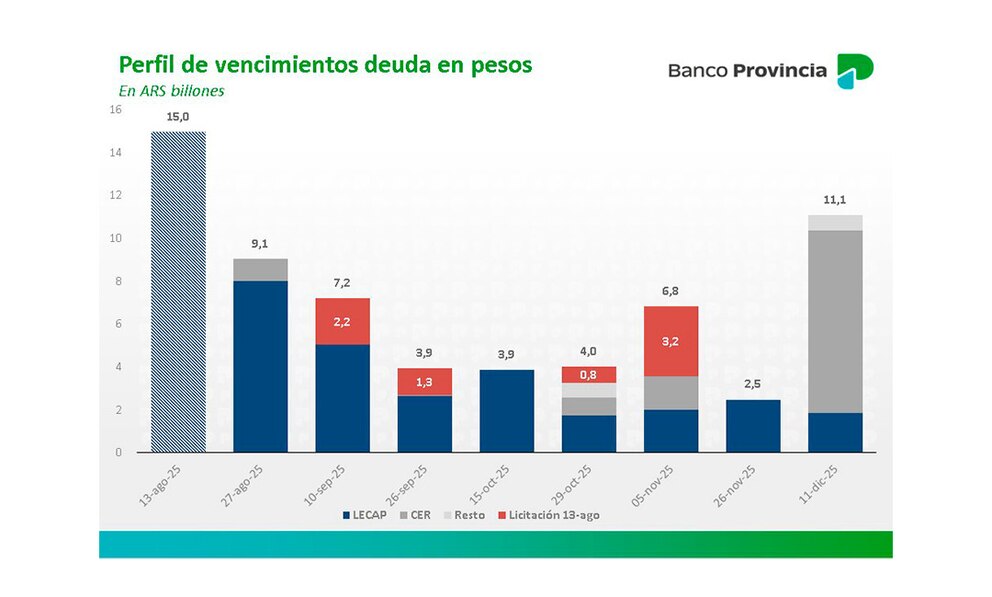 En julio, los encajes promediaron $14 billones, pero la necesidad de efectivo mínimo para agosto se ubicaría por encima de los $19 billones. En los primeros días de agosto, los encajes promediaron $18,6 billones, lo que anticipaba que “probablemente los bancos no renueven todos sus vencimientos”.