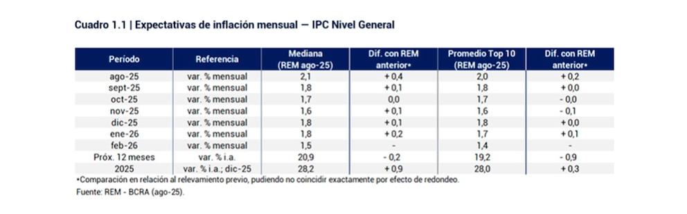 Para los meses siguientes, se prevé que la inflación mensual oscile entre 1,6% y 1,8%, descendiendo al 1,5% recién en febrero de 2026, el último mes contemplado en las proyecciones del REM.
