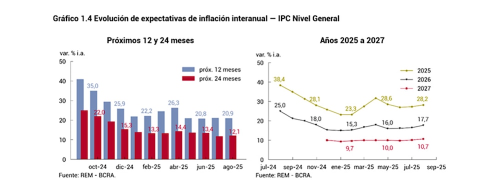 En cuanto a las tasas de interés de los bancos privados, se espera que en septiembre alcancen un 54,8% nominal anual, lo que supone un incremento de 21,8 puntos porcentuales respecto al sondeo anterior. Para diciembre de 2025, la tasa proyectada es de 35,25%, mientras que para el conjunto del año se prevé un nivel de 24,90%, apenas 0,4 puntos por encima del REM previo.