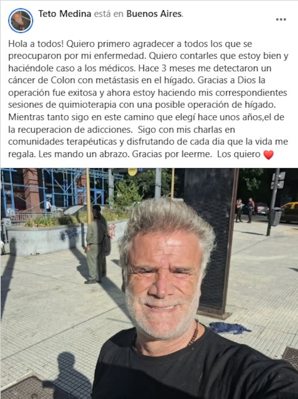En medio del tratamiento, no abandonó el camino que eligió en los últimos años y que, pese al diagnóstico, continúa encontrando sentido en ese trabajo cotidiano. “Mientras tanto, sigo en este camino que elegí hace algunos años, el de la recuperación de adicciones. Sigo con mis charlas en comunidades terapéuticas y disfrutando de cada día que la vida me regala”, compartió, reafirmando el compromiso con una tarea que considera central en su vida actual.